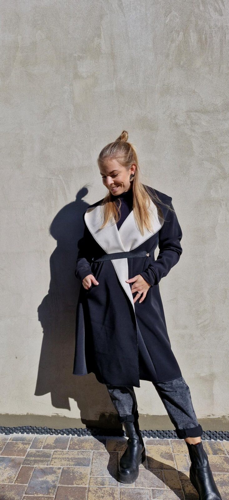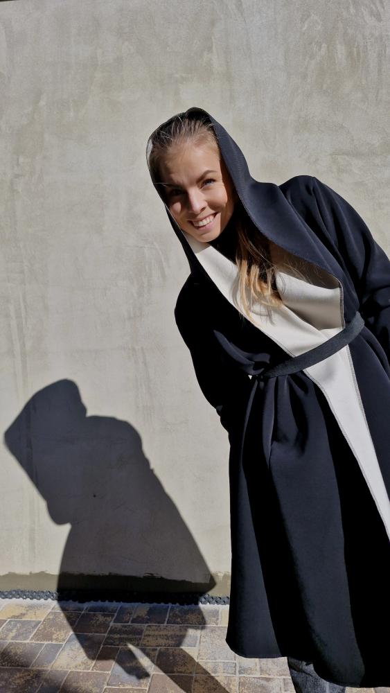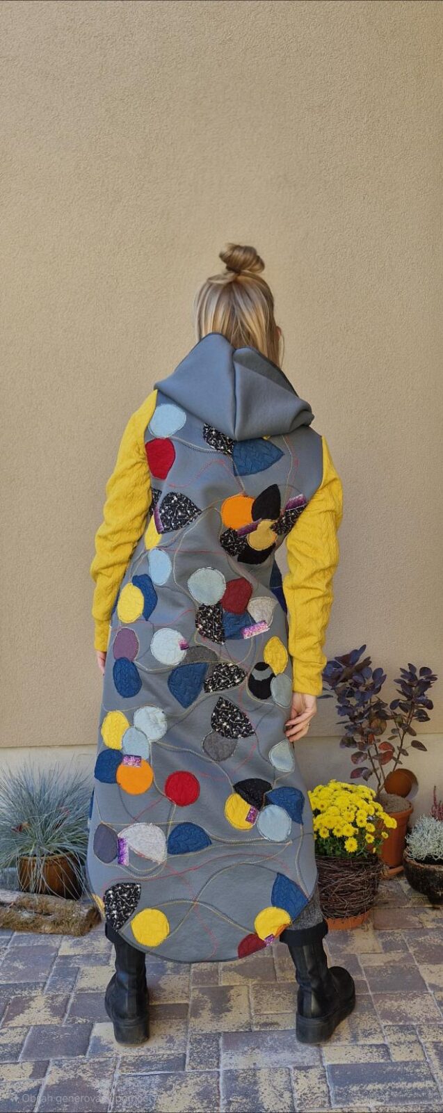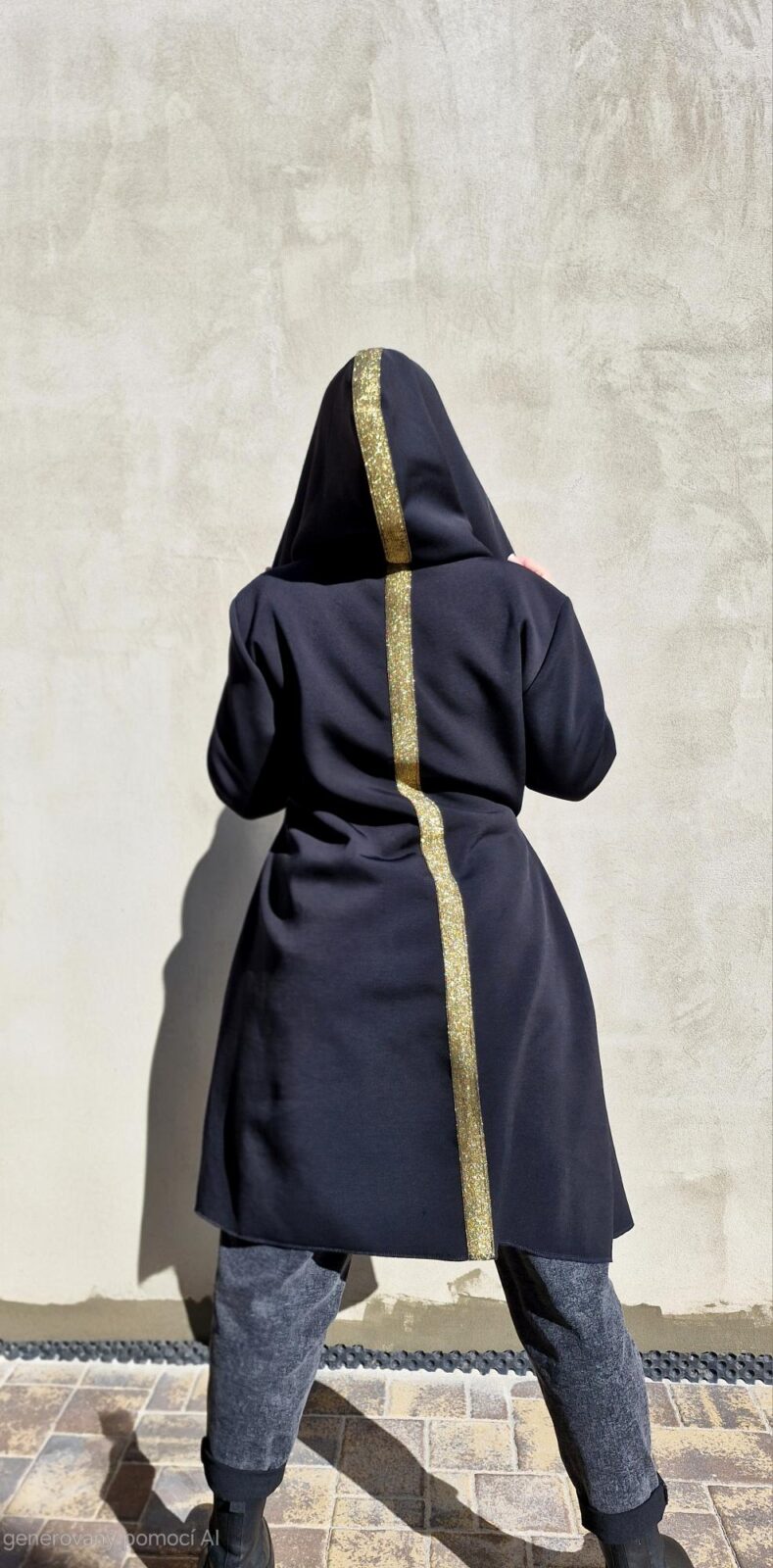 Dámský kabátek s kapucí a kapsami. Díky cípům, které směřují podél boků, kabátek krásně zeštíhluje. V zadním středu je všitý zlatý pruh.