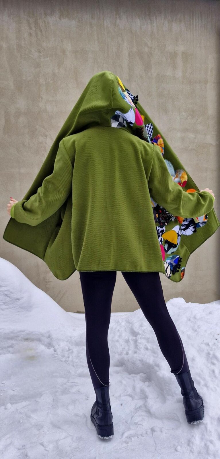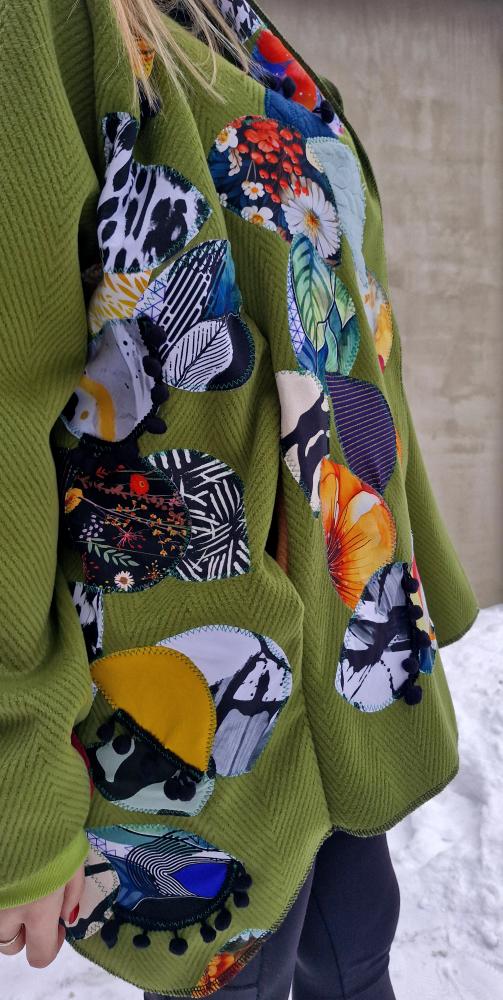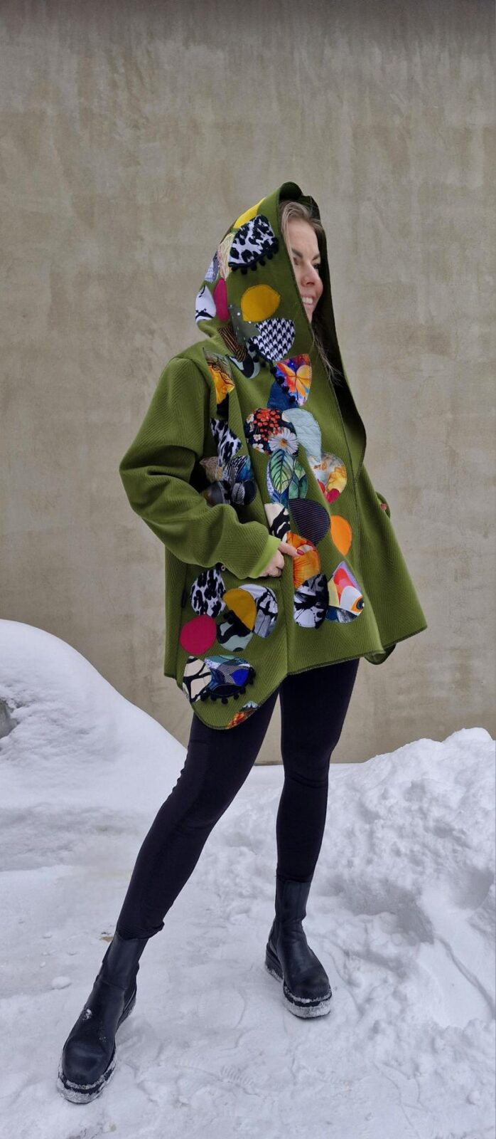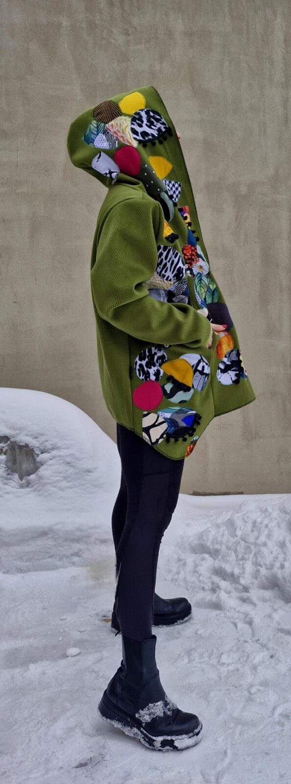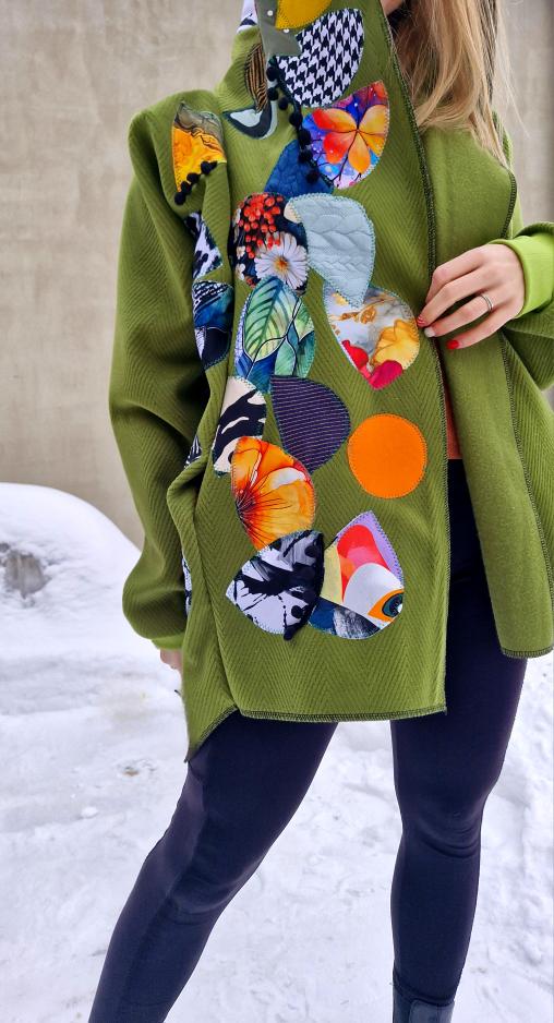 Dámský kabátek s kapucí. Jedná se o můj projekt, kdy žádný kousek látky nepřijde na zmar. Zbytky látek mi stříhala má milovaná babička, která tu již