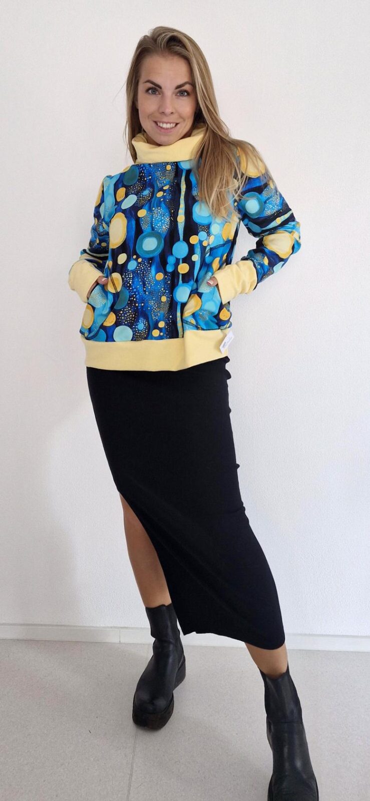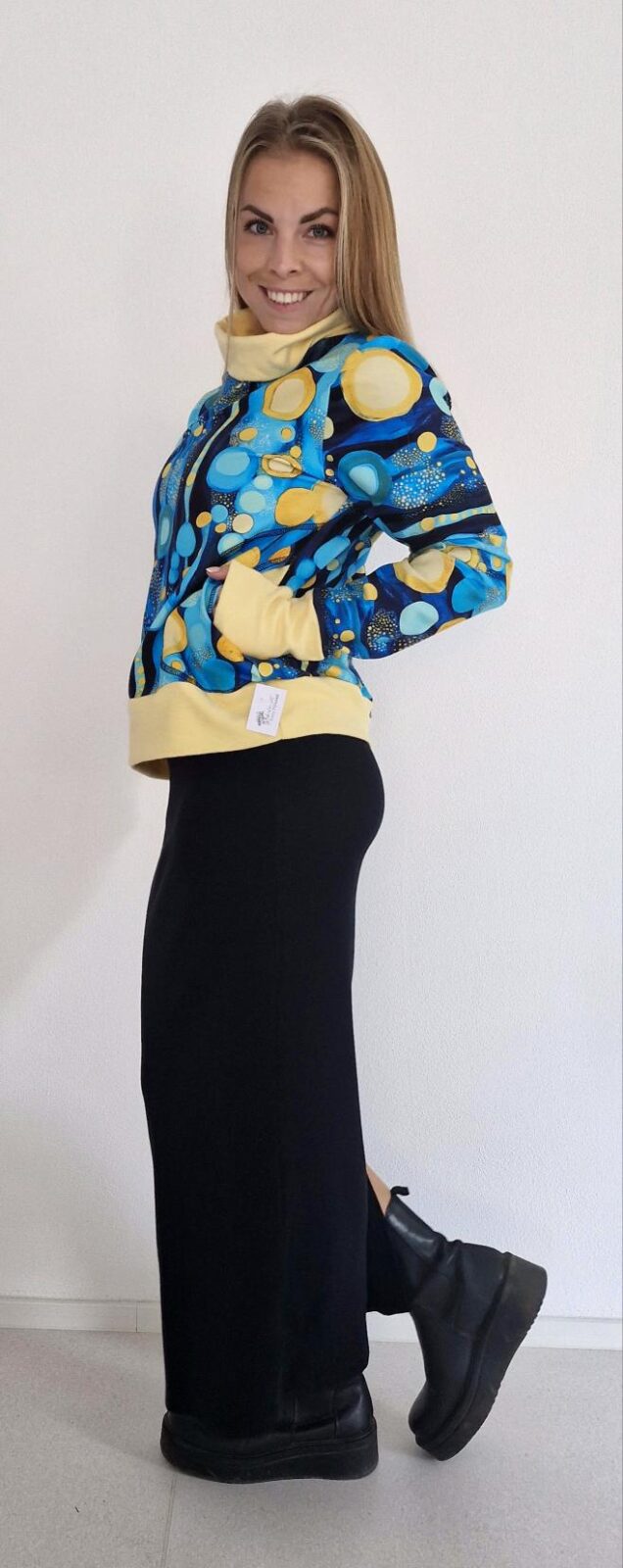 Dámská mikina s límcem a kapsami. V dolním okraji je všitý pružný lem.
