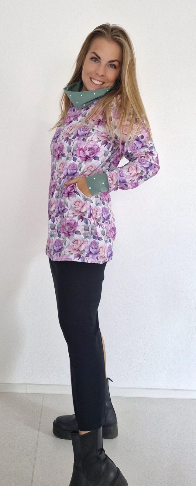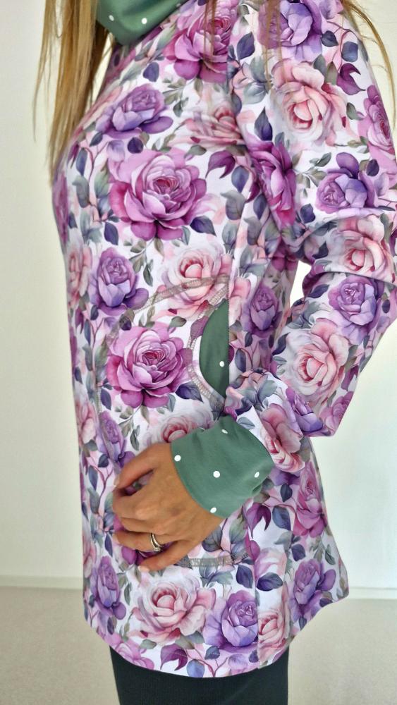 Dámská mikina s límcem a kapsami. V dolním okraji je všitý pružný lem.