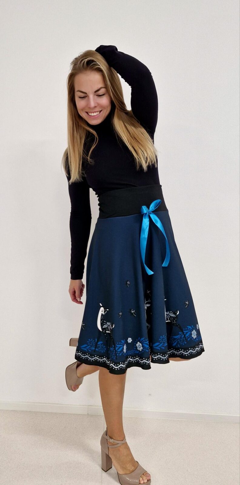 Dámská, půlkolová sukně všitá do pružného lemu, který je vysoký a díky němu hezky stáhne oblast bříška.