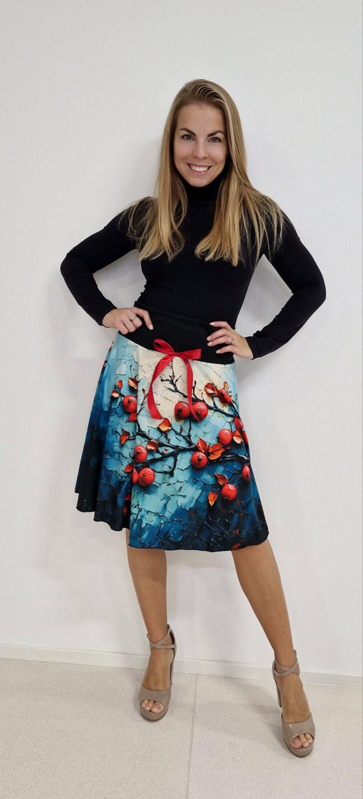 Dámská, půlkolová sukně všitá do pružného lemu, který je vysoký a díky němu hezky stáhne oblast bříška.