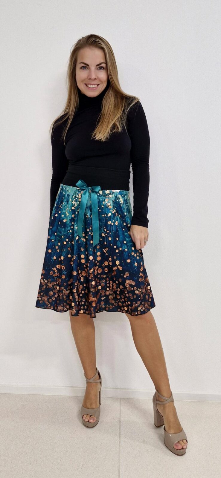 Dámská, půlkolová sukně všitá do pružného lemu, který je vysoký a díky němu hezky stáhne oblast bříška.