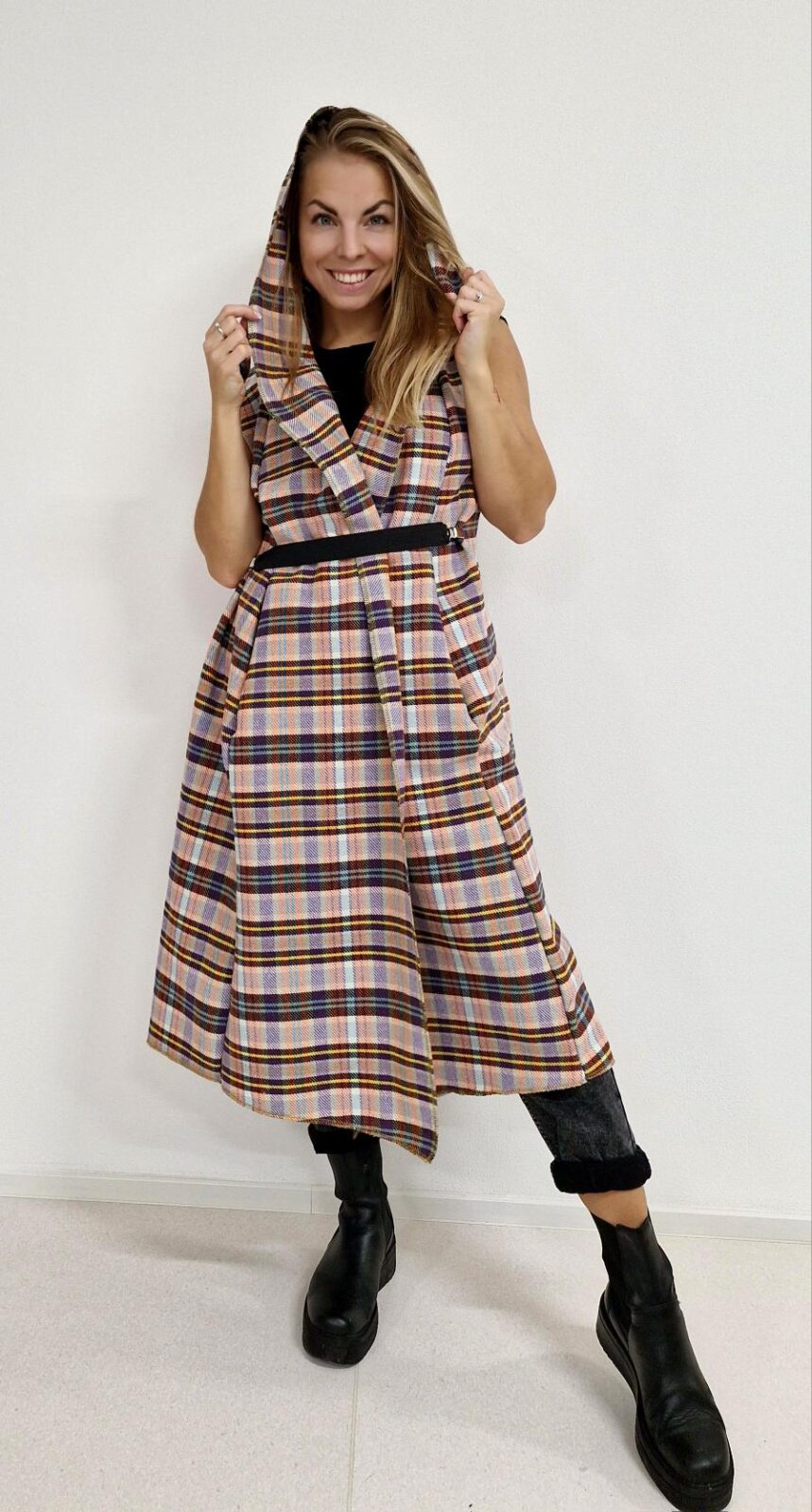 Díky cípům, které směřují podél boků, kabátek krásně zeštíhluje.
