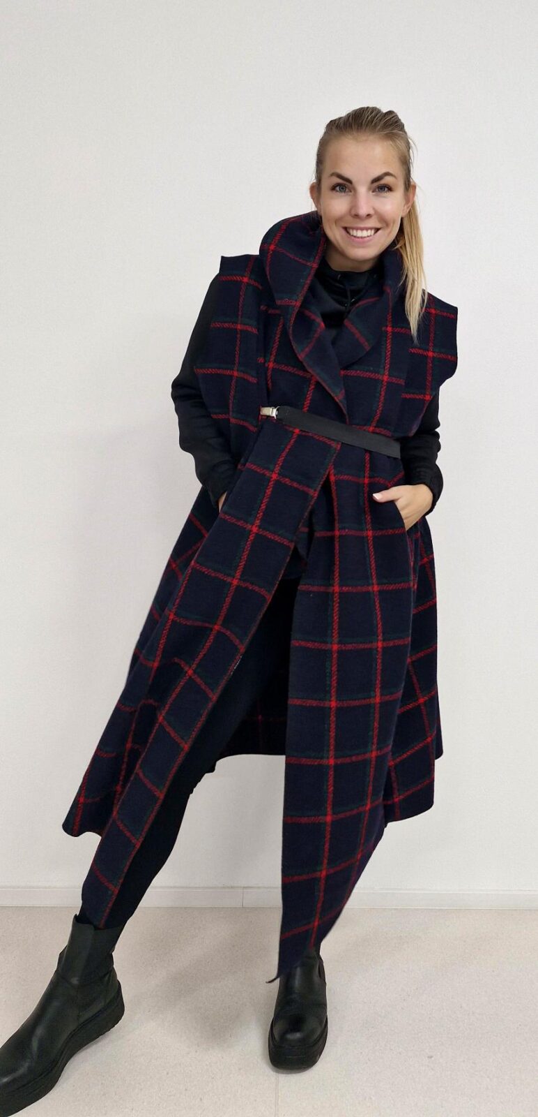 Díky cípům, které směřují podél boků, kabátek krásně zeštíhluje.