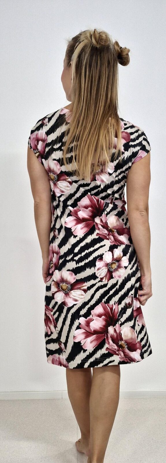 Dámské, áčkové šaty s přinechaným krátkým rukávem a lodičkovým výstřihem.