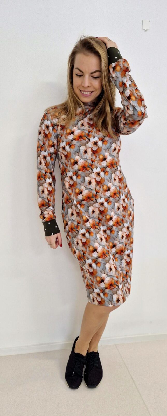 Dámské, áčkové šaty s dlouhým rukávem. V průkrčníku je zhotoven stéjáček.