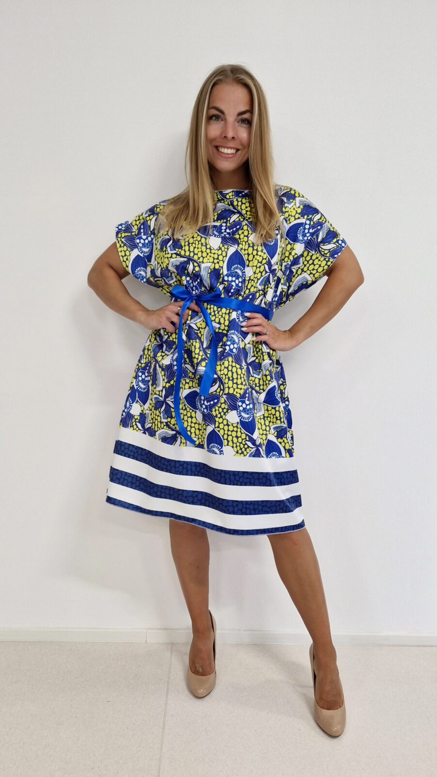 Dámské áčkové šaty s přinechaným, krátkým rukávem. Šaty jsou ušité ze saténu.