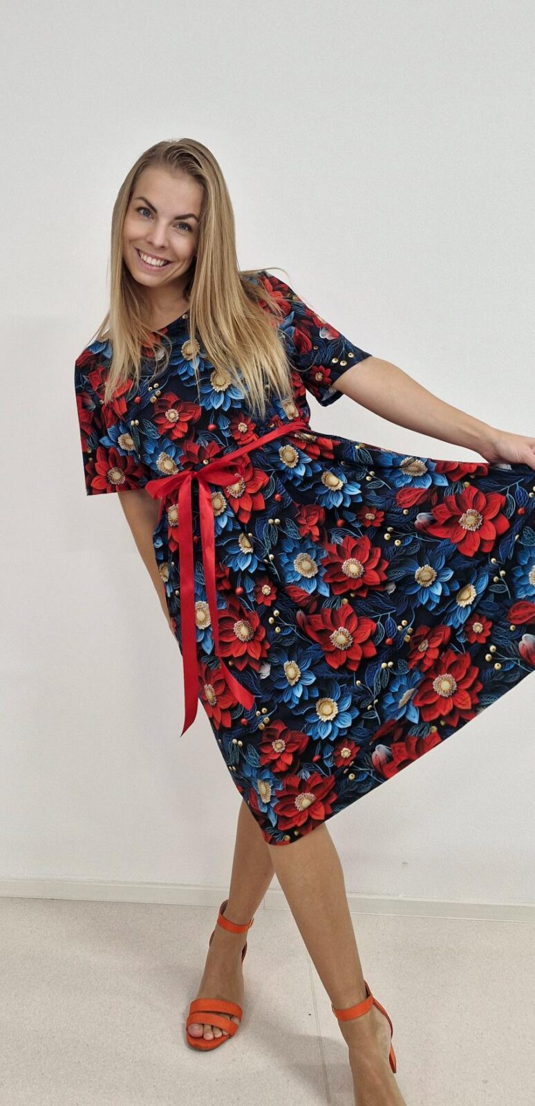 Dámské áčkové šaty, se skládanou sukní, s krátkým rukávem a lodičkovým výstřihem. V bočních švech jsou zhotoveny kapsy.