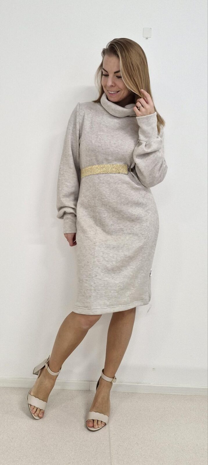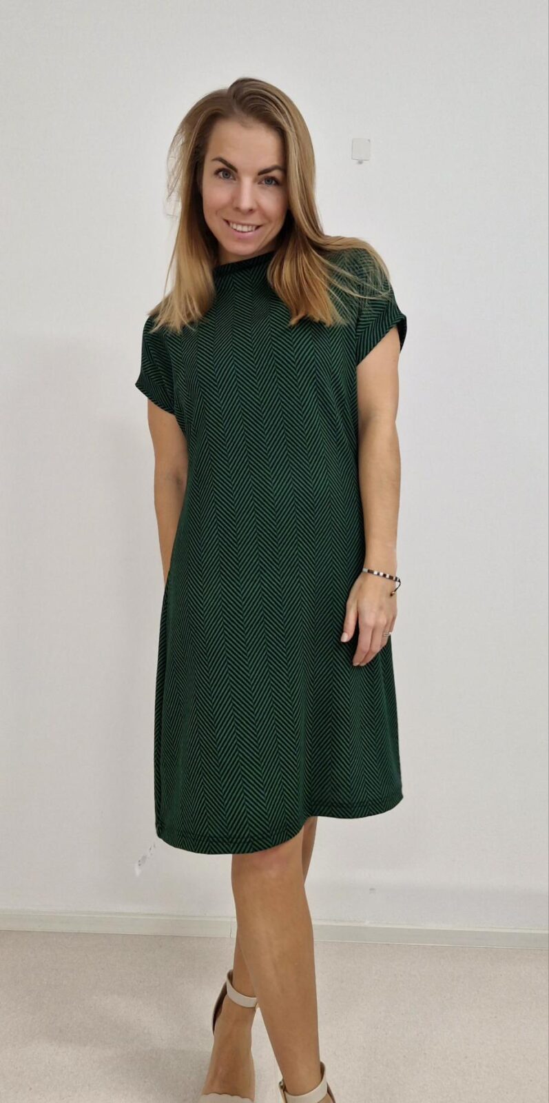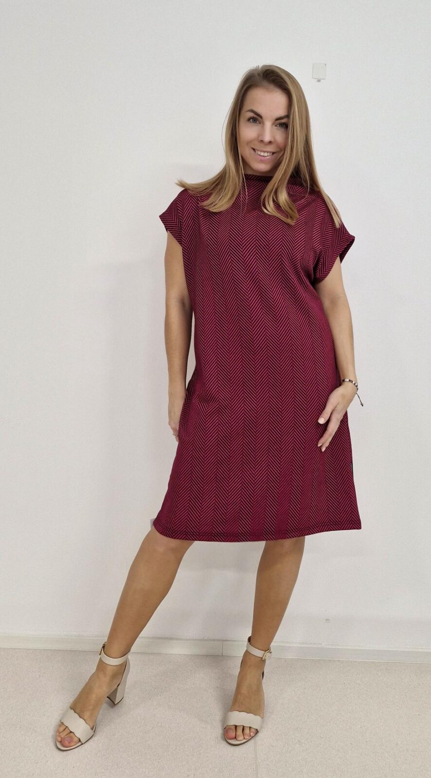 Dámské, áčkové šaty s krátkým, přinechaným rukávem. Dolní okraj je střižen dokulata. Výstřih je klasický lodičkový. Šaty jsou ušité z 95% polyesteru a 5% elastanu – proto se nemusí žehlit.