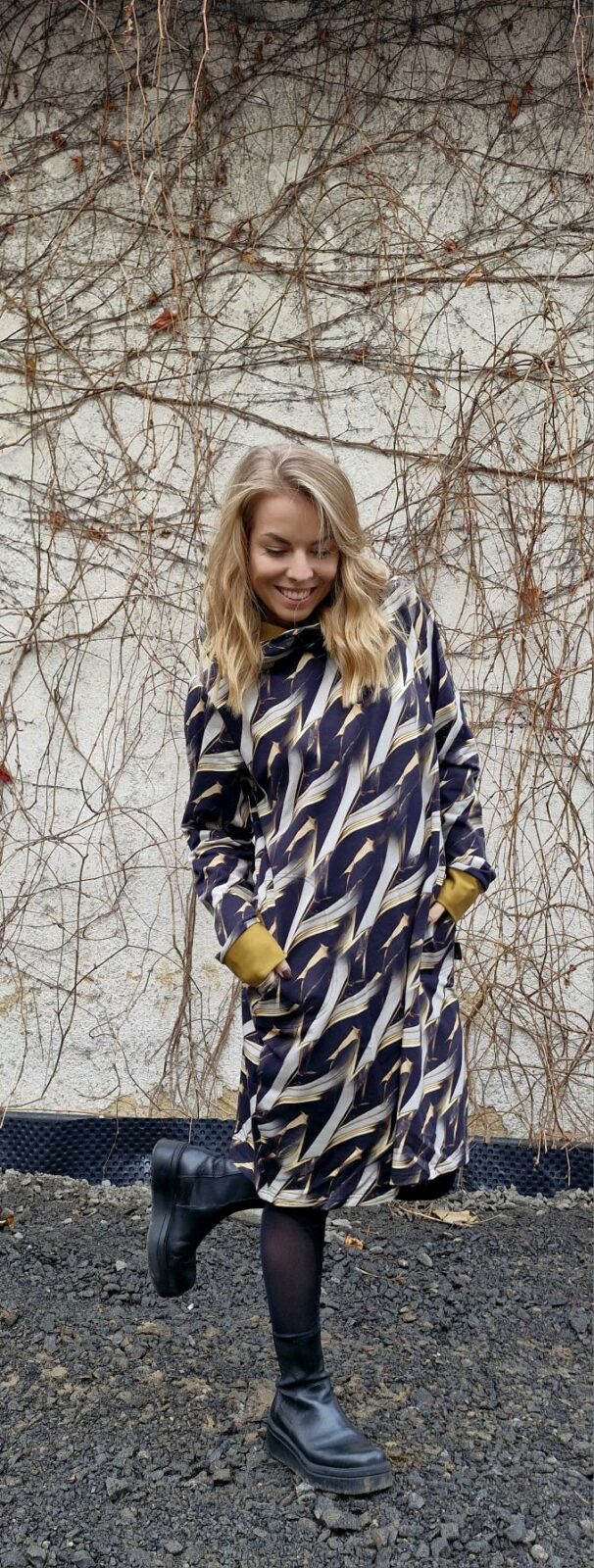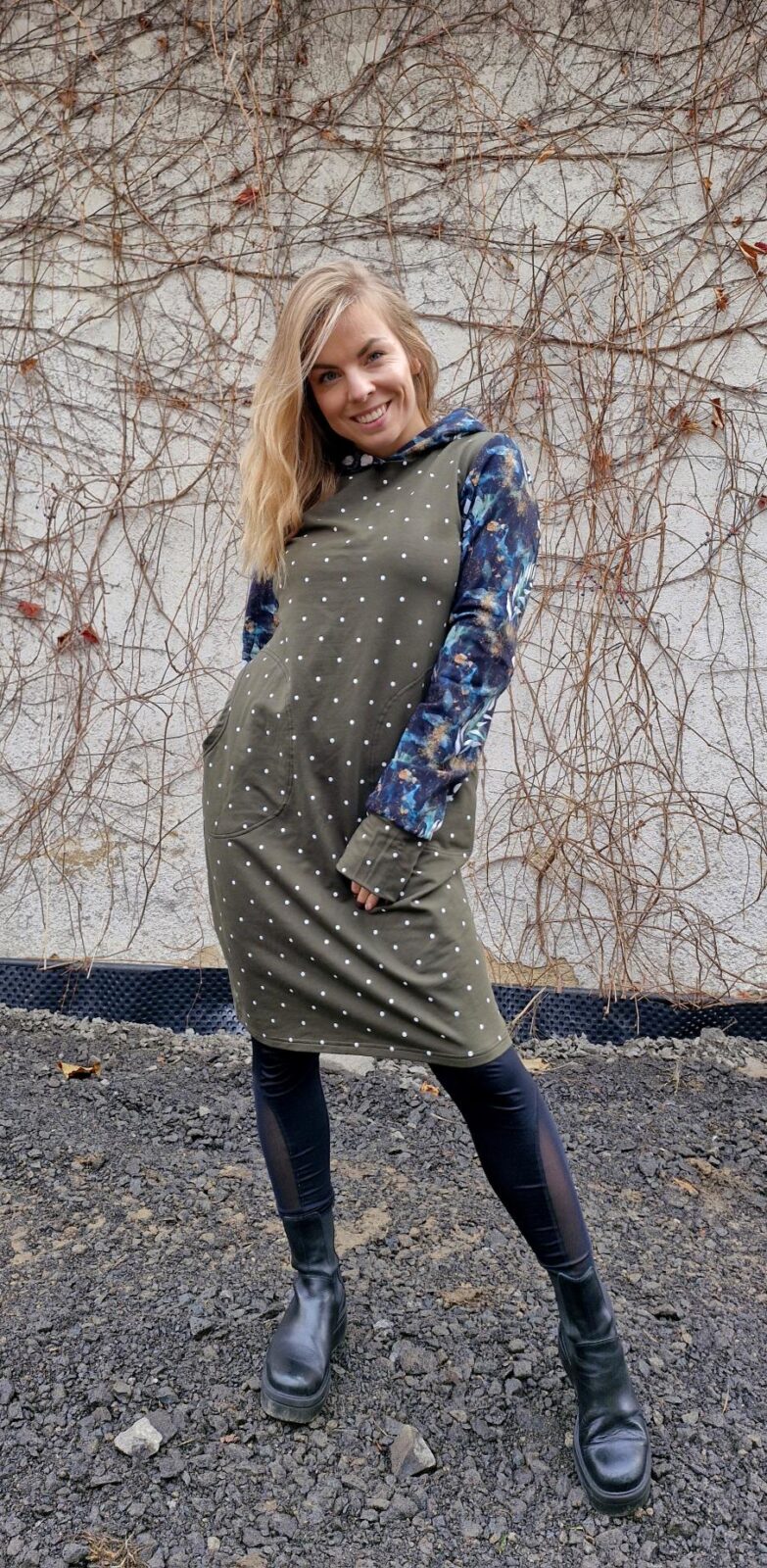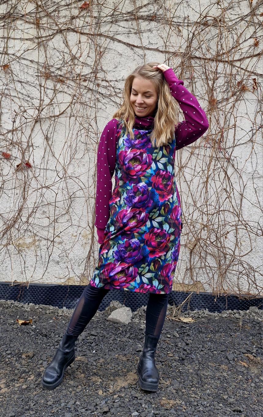 Délka šatů je 90 cm, délka rukávů je 54 cm, obvod hrudníku 94 – 104 cm. Obvod pasu do 88 cm, obvod sedu do 112 cm.