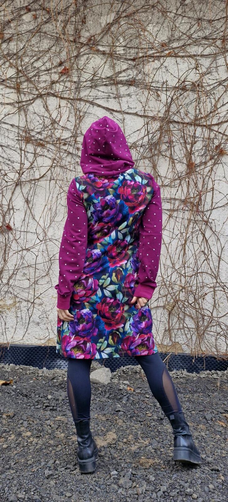 Dámské mikinové šaty s kapsami, kapucí a dlouhým rukávem.