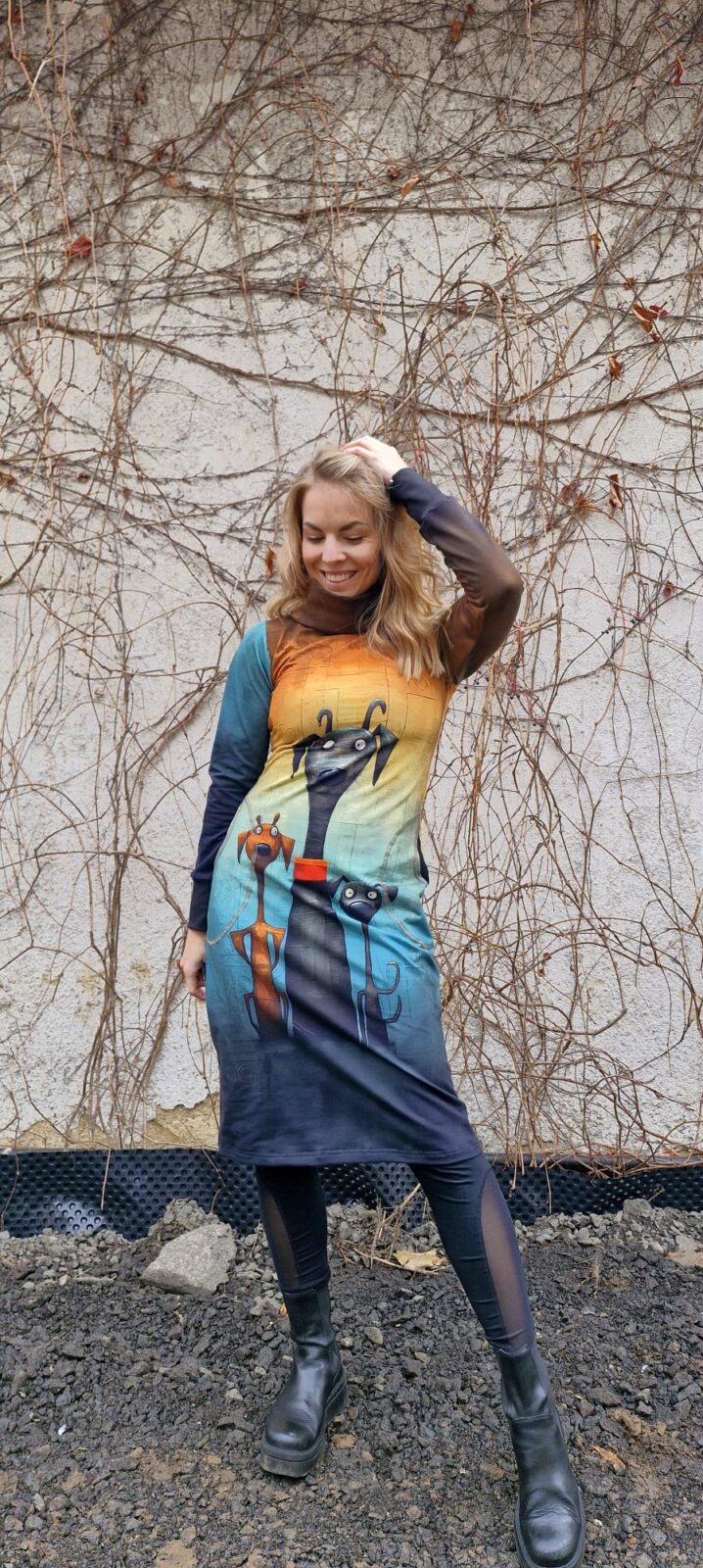 Délka šatů je 97 cm, délka rukávů je 68 cm včetně manžety. Obvod hrudníku 100 – 110 cm, obvod pasu do 110 cm, obvod sedu do 130 cm.