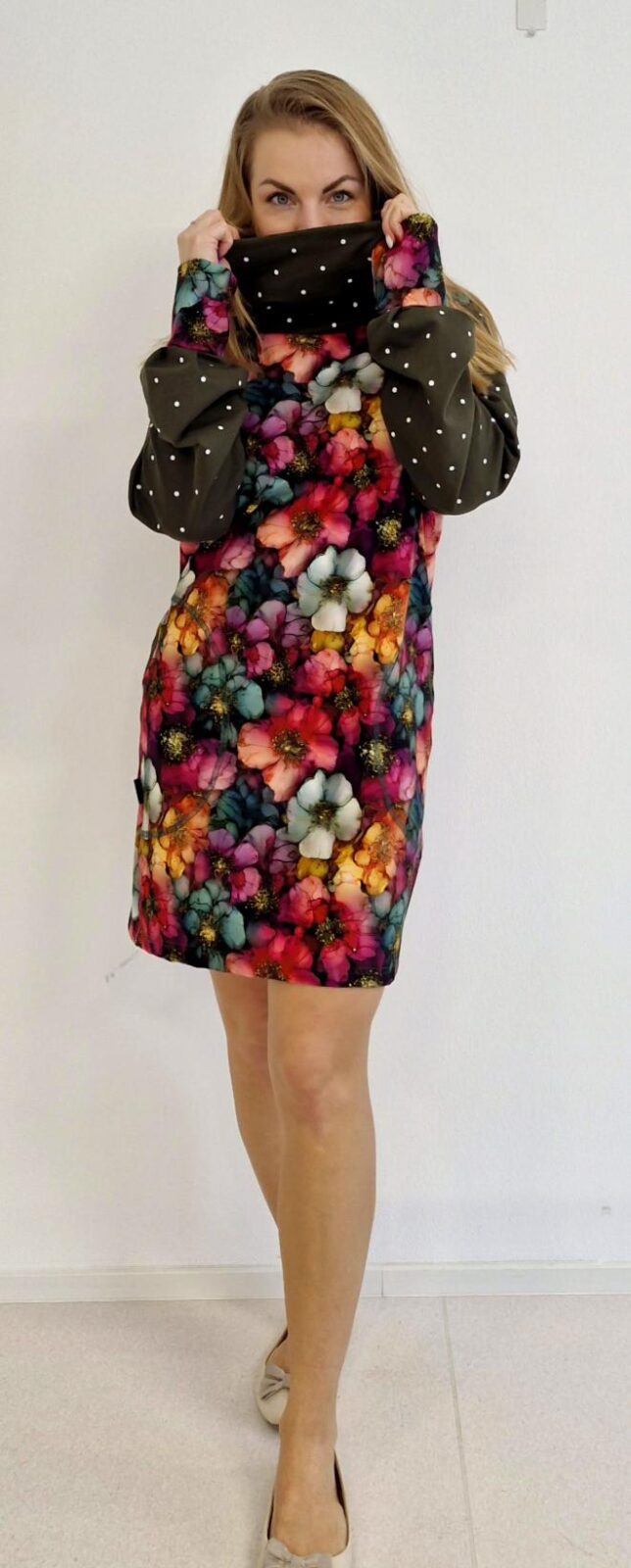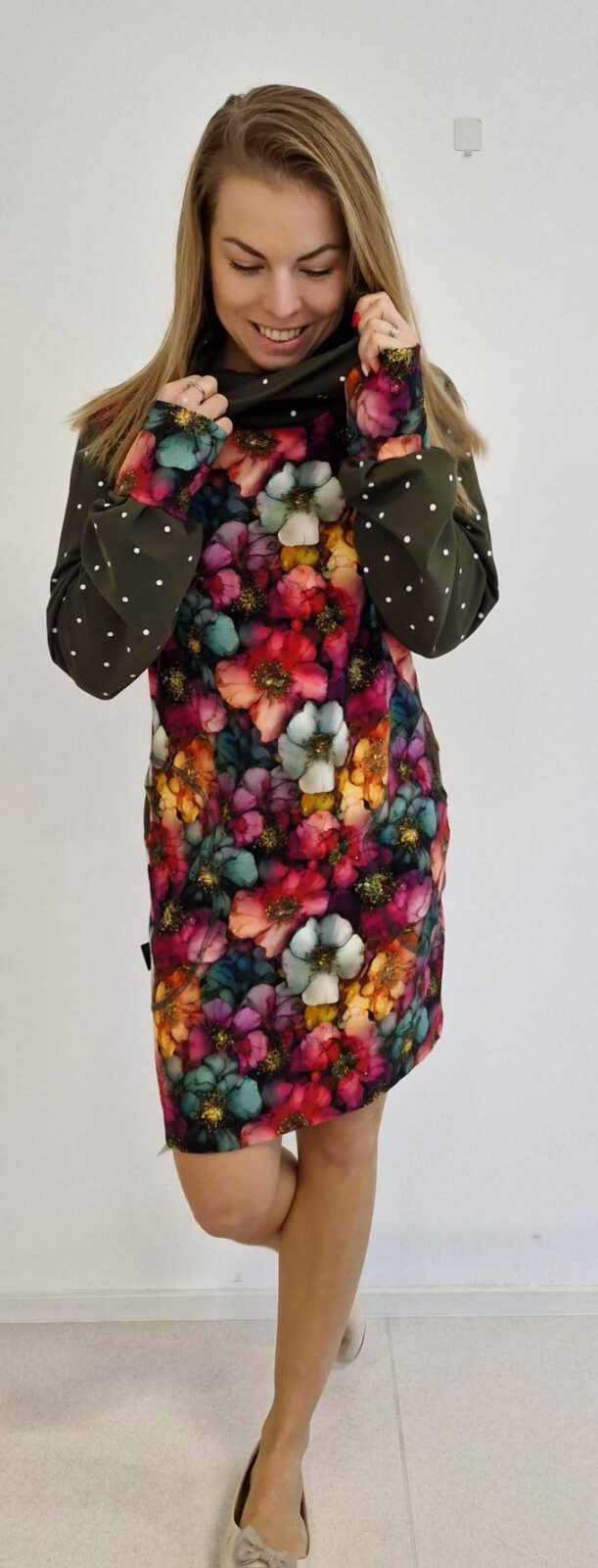 Šaty jsou ušité z bavlněné teplákoviny. Rukávy jsou zhotoveny z jemného micro fleecu, který krásně hřeje.