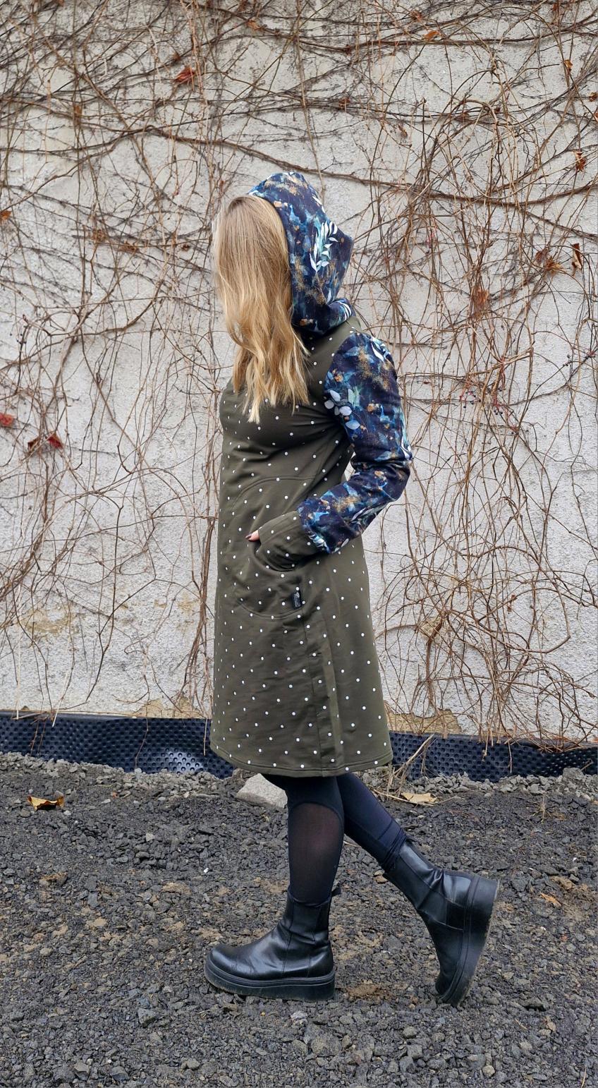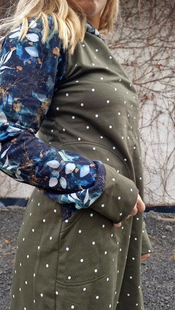 Dámské mikinové šaty s kapsami, kapucí a dlouhým rukávem.