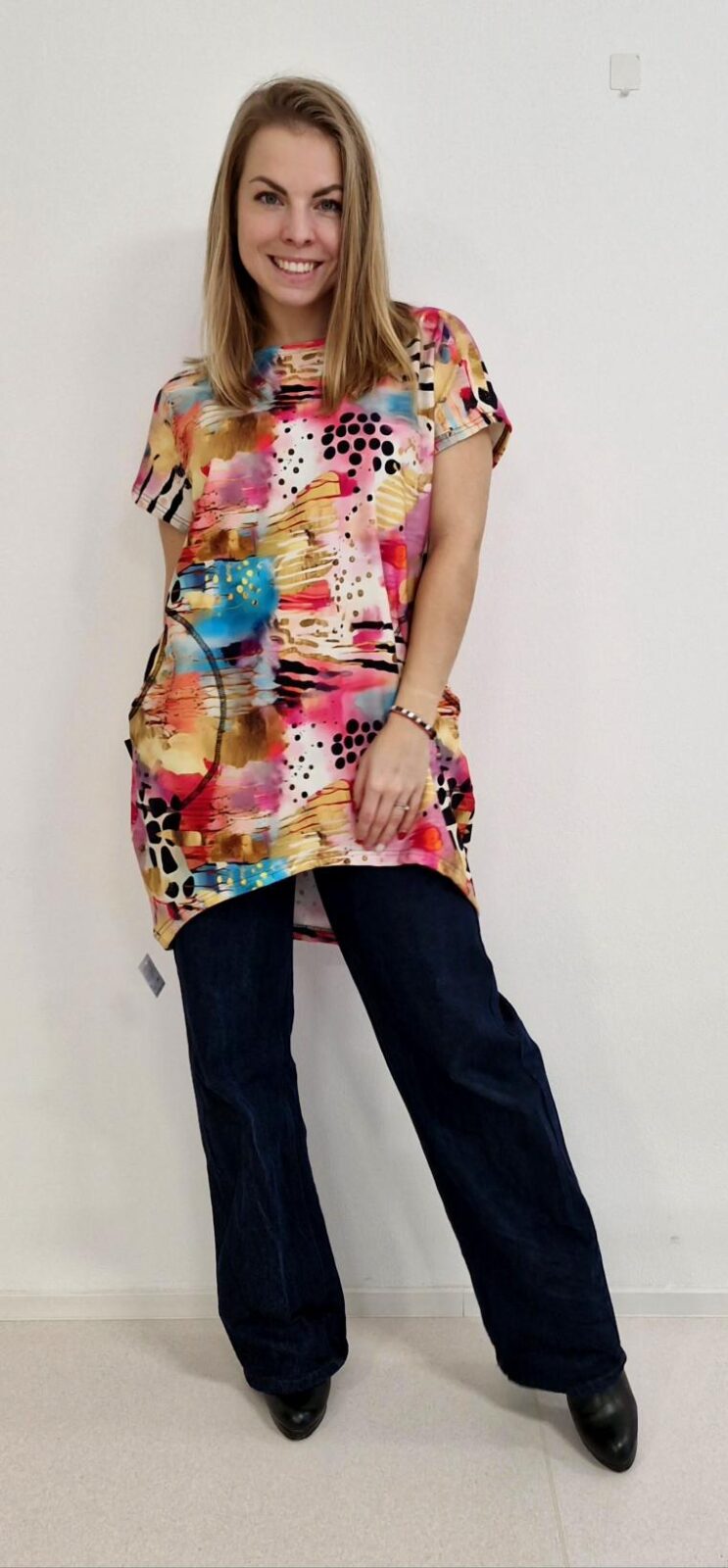 Šaty jsou ušité 46% viskóza, 36% polyesteru, 19% polyamidu.