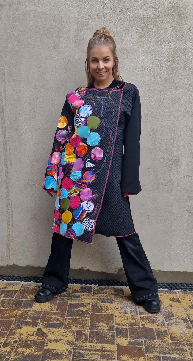 Dámské šaty s přinecchaným krátkým rukávem, lodičkovým výstřihem. Sukně je ušitá z pevného, bavlněného, žebrovaného úpletu, který krásně pruží.