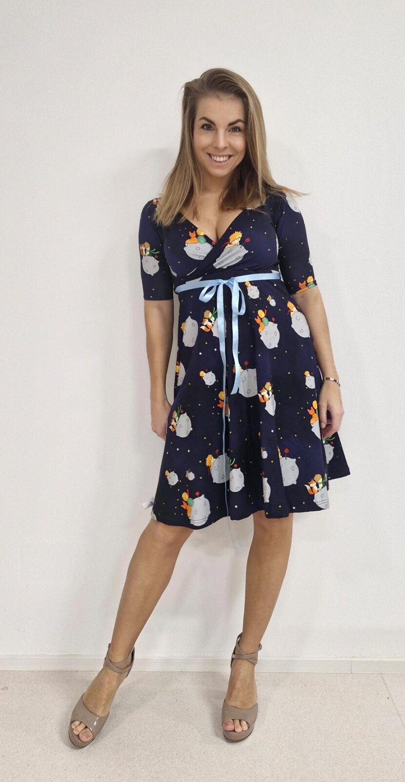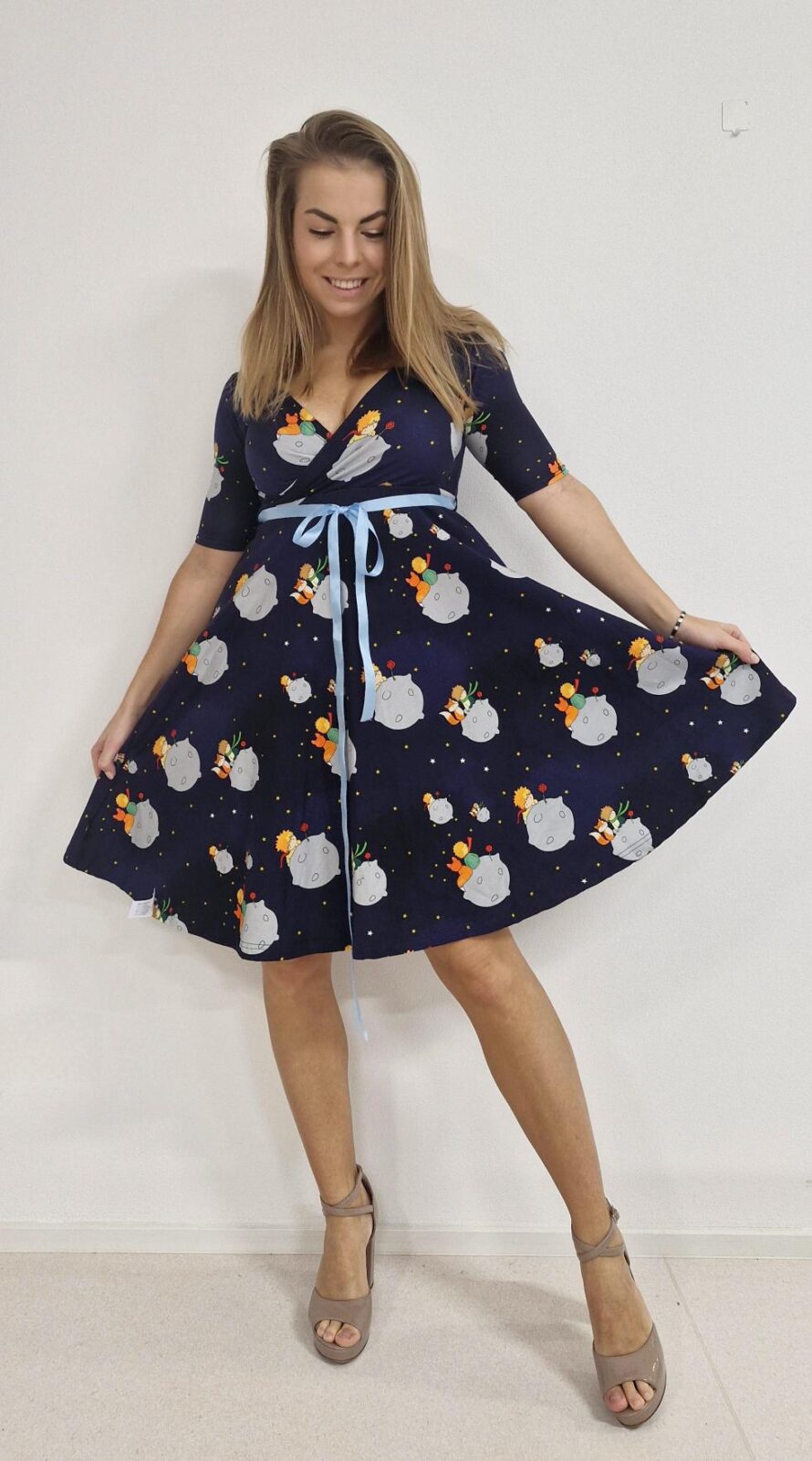 Dámské šaty s překřížením na prsou, půlkolovou sukní a 3/4 rukávem.