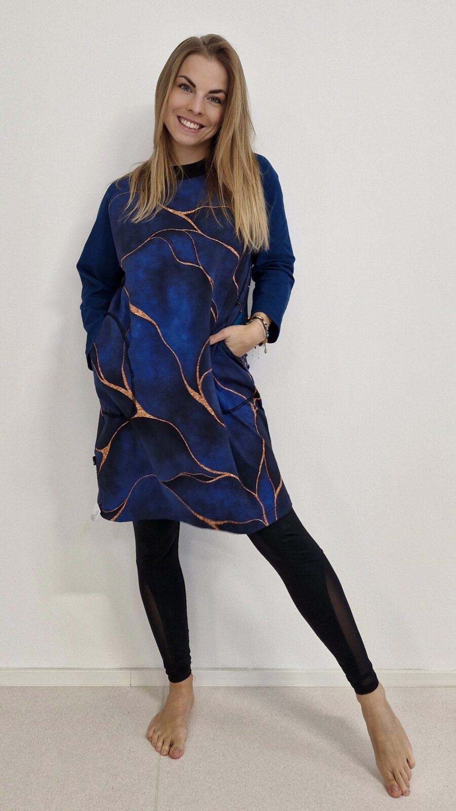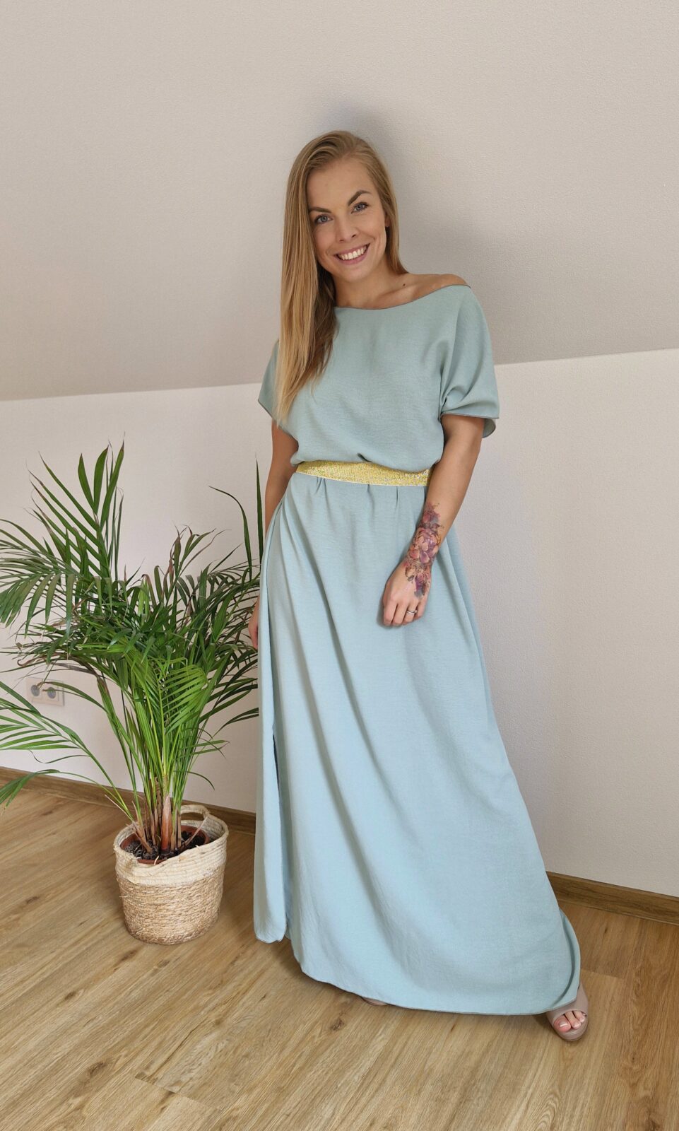 Dámské šaty s přinechaným rukávem. V pase přestřižené a doplněné pruženkou (gumou).