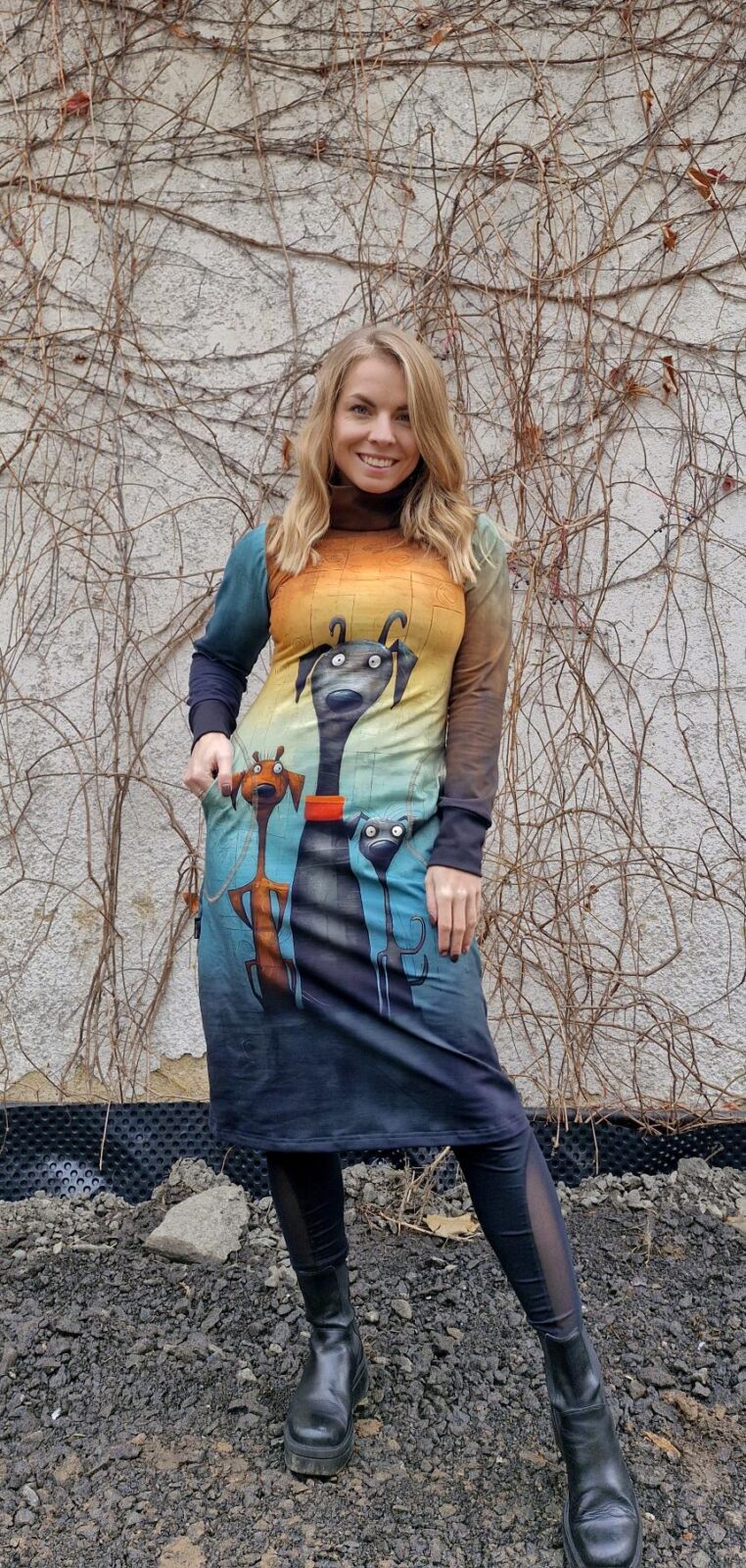 Dámské šaty s límcem, kapsami zhotoveny v bočních švech. Rukávy jsou dlouhé a rovné.