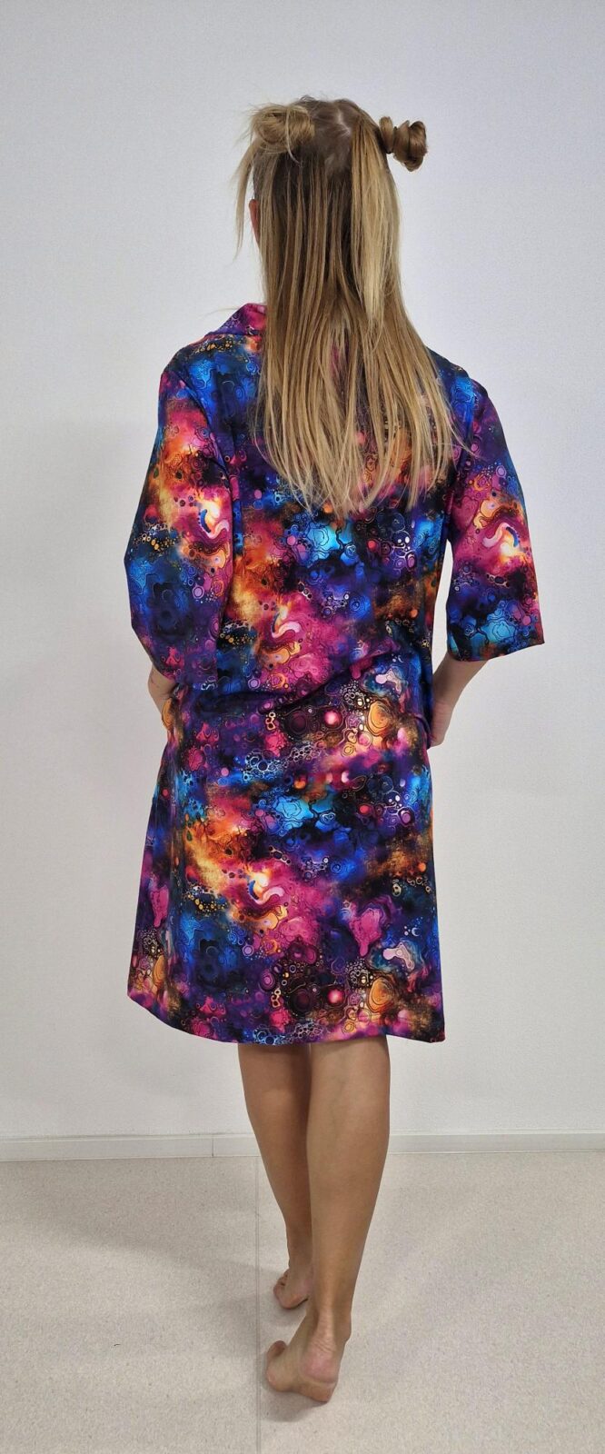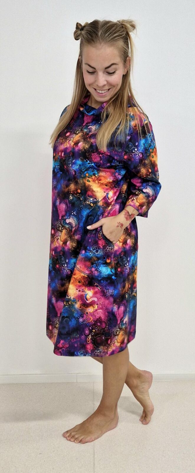 Dámské, áčkové šaty s 3/4 rukávem. V bočních švech jsou zhotoveny kapsy.V průkrčníku je zhotovený límec.