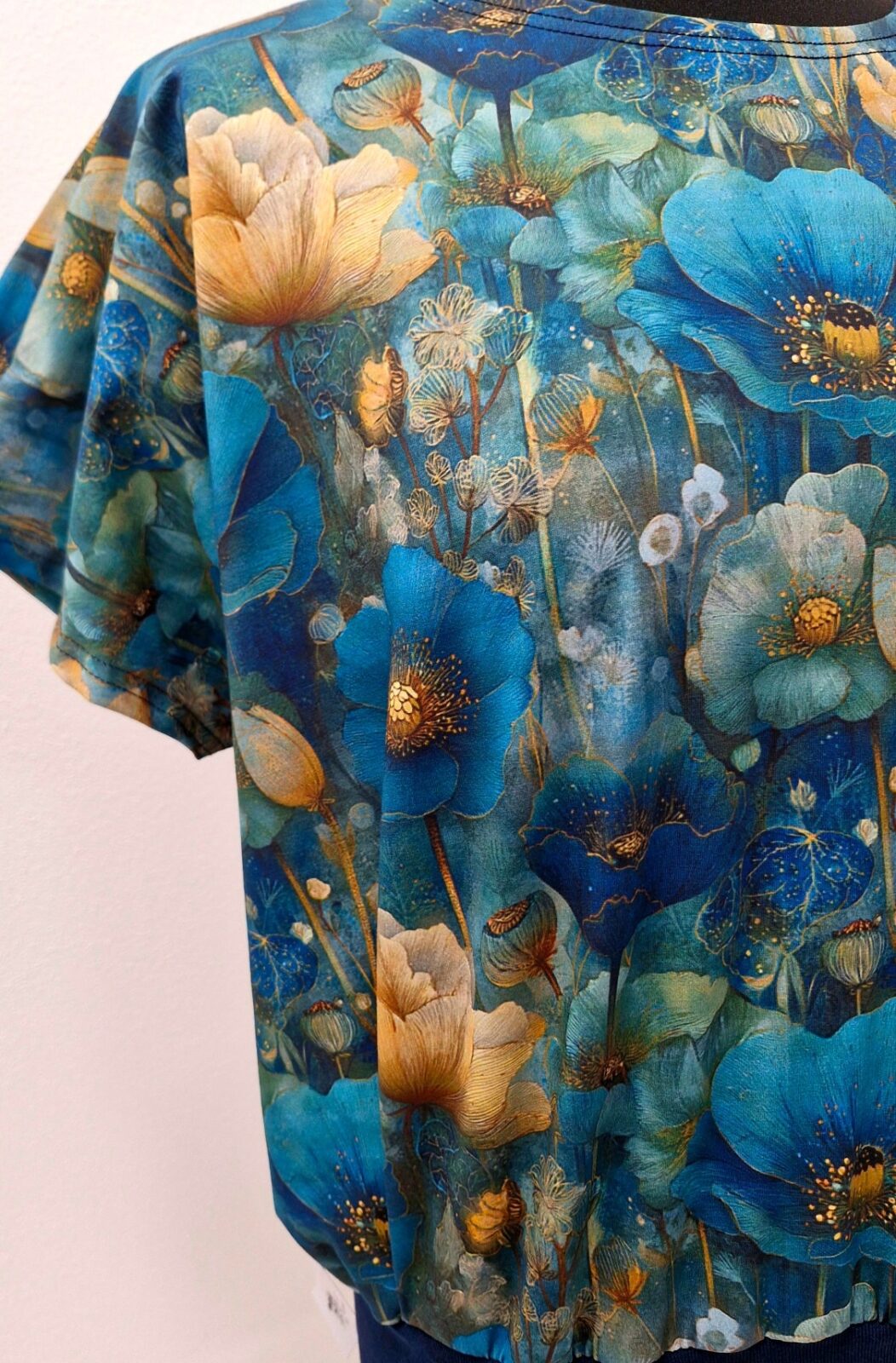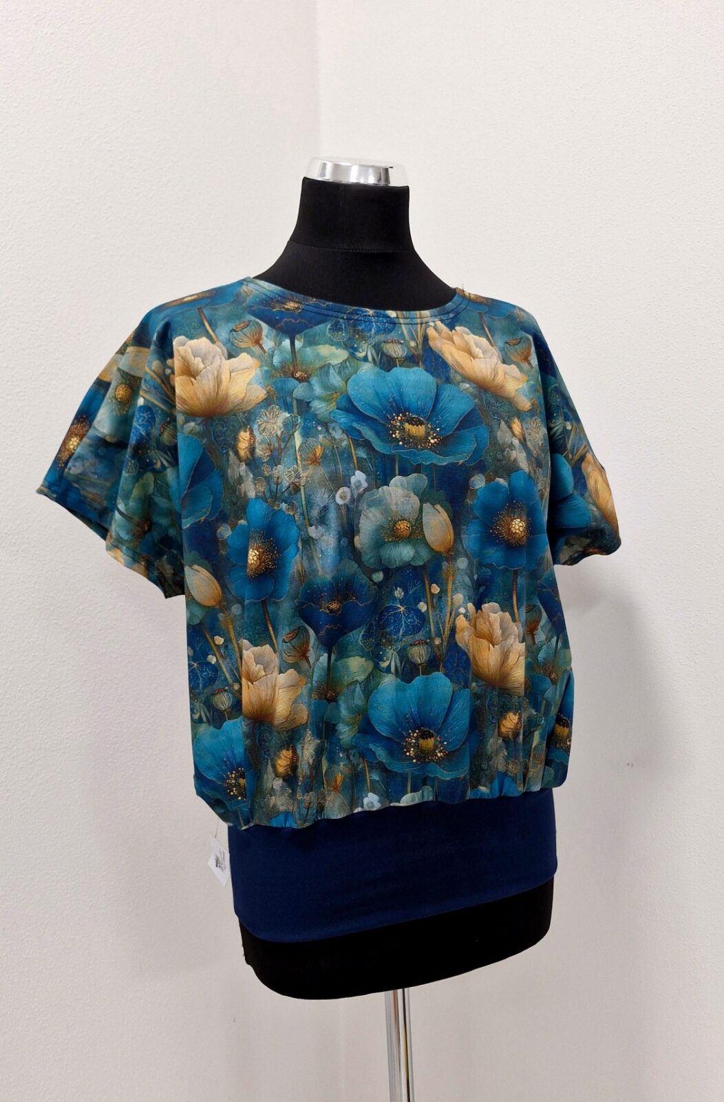 Dámské tričko s přinechaným krátkým rukávem, ušité z bavlněného úpletu. V dolním okraji je všitý pružný lem, který schová lecjaký nedostatek na bříšku :).