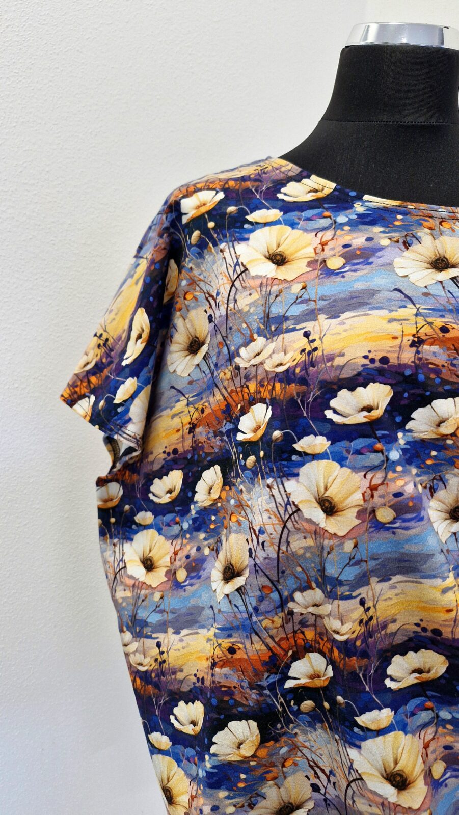 Dámské tričko s přinechaným krátkým rukávem, ušité z bavlněného úpletu. V dolním okraji je všitý pružný lem, který schová lecjaký nedostatek na bříšku :). Rukávy jsou asymetrické – jeden krátký jeden o chlup delší.