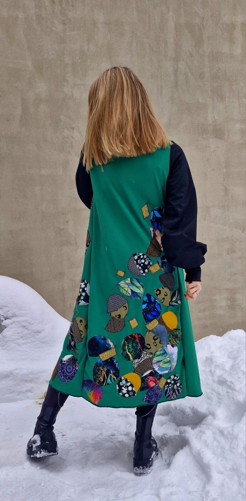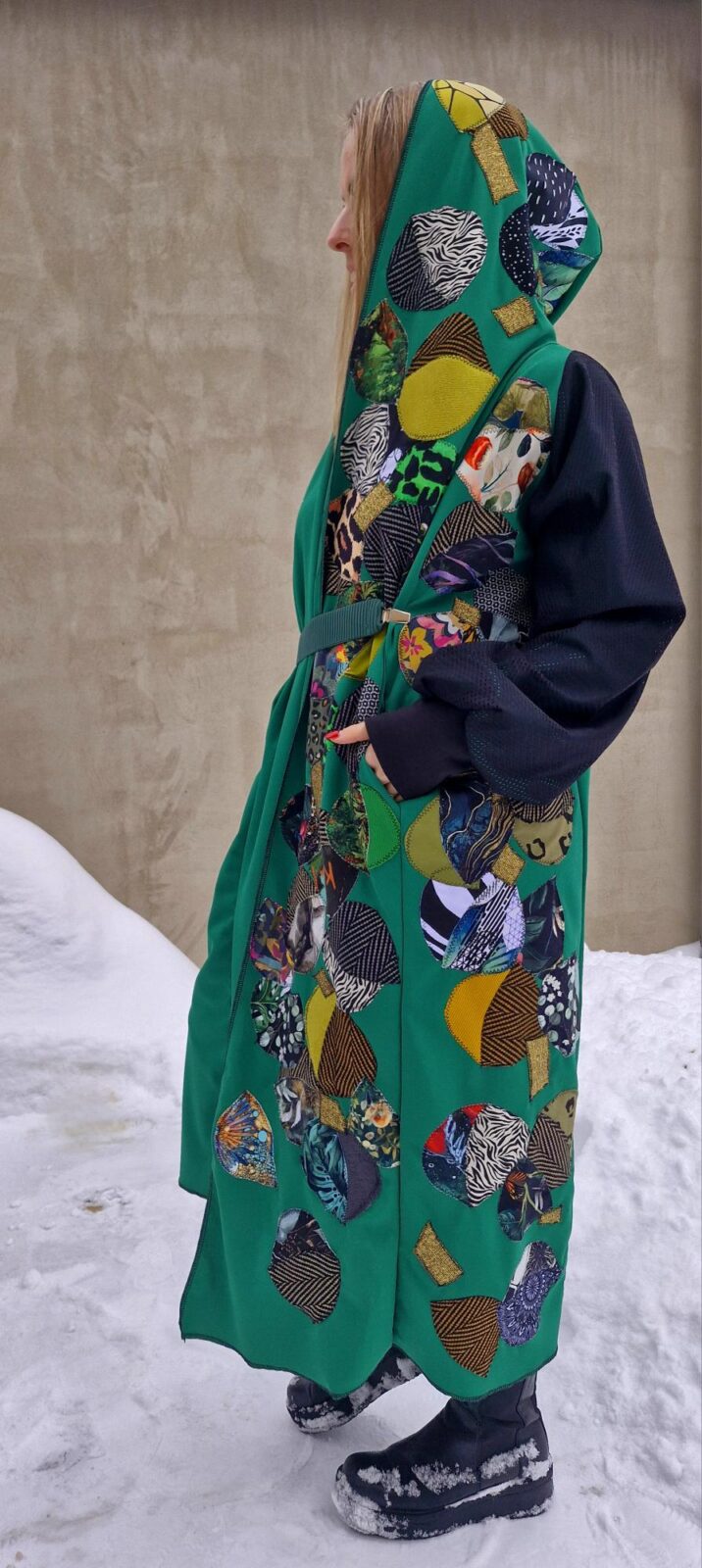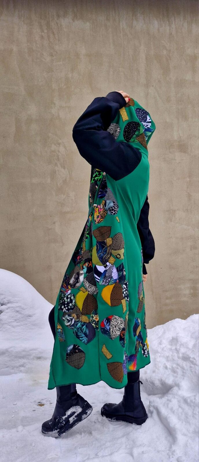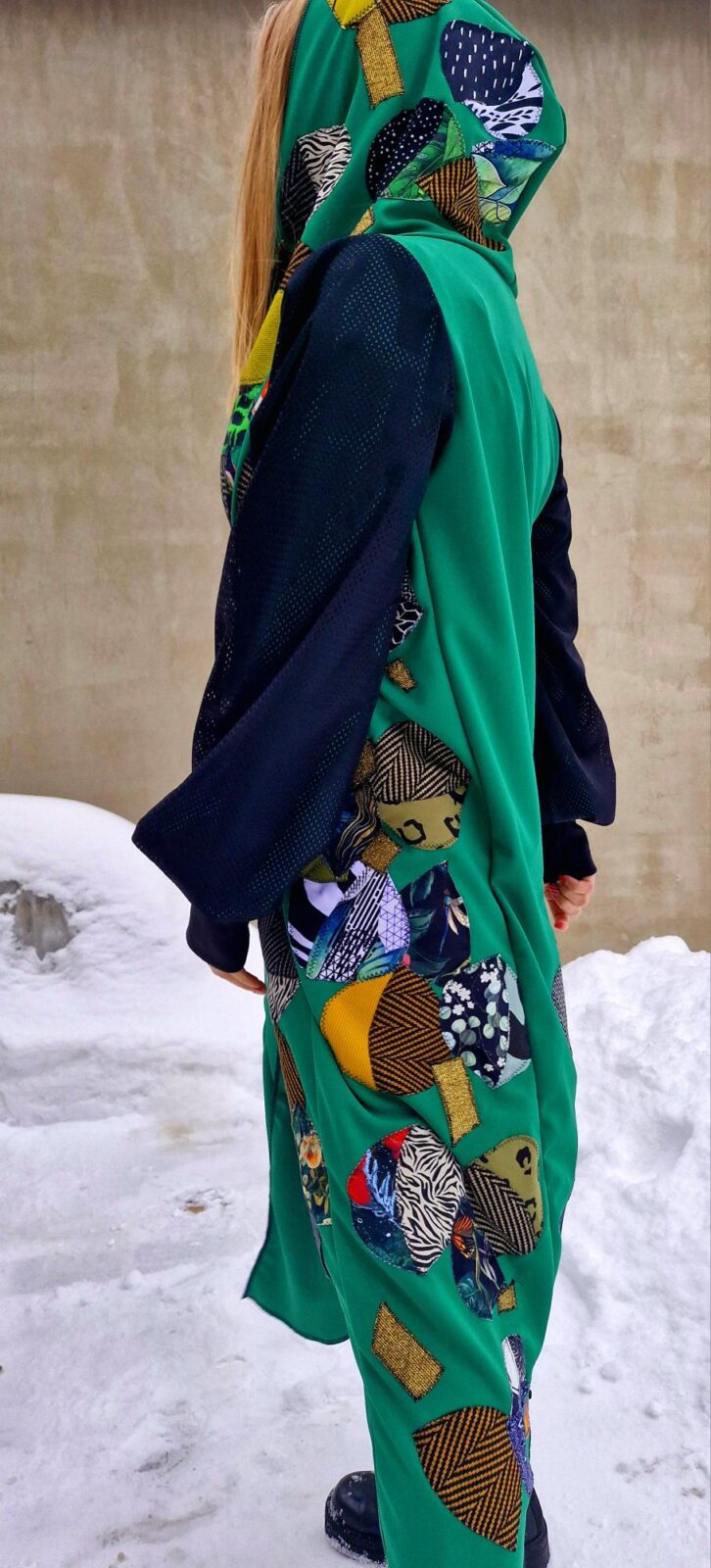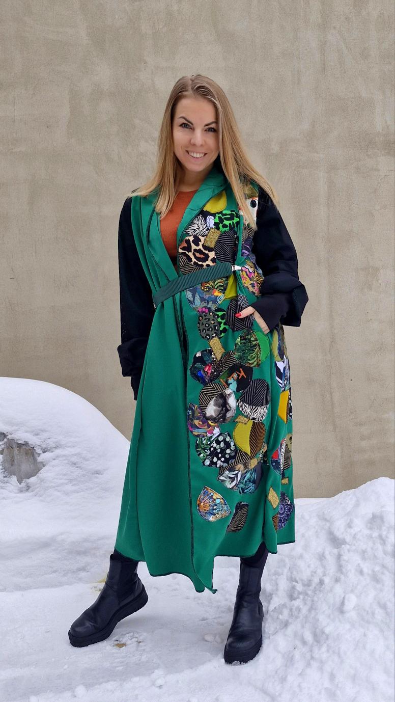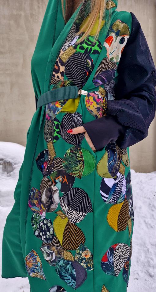 Dámský kabátek s kapucí a kapsami. Jedná se o můj projekt, kdy žádný kousek látky nepřijde na zmar. Zbytky látek mi stříhala má milovaná babička, která tu již 11 měsíců není, ale její energie je právě tady, v kabátku. Každičký kousek vzala do ruky. Nikde takový podobný kabátek na světě není, nechodí. Rukávy jsou ušité ze síťoviny, která je podšitá.