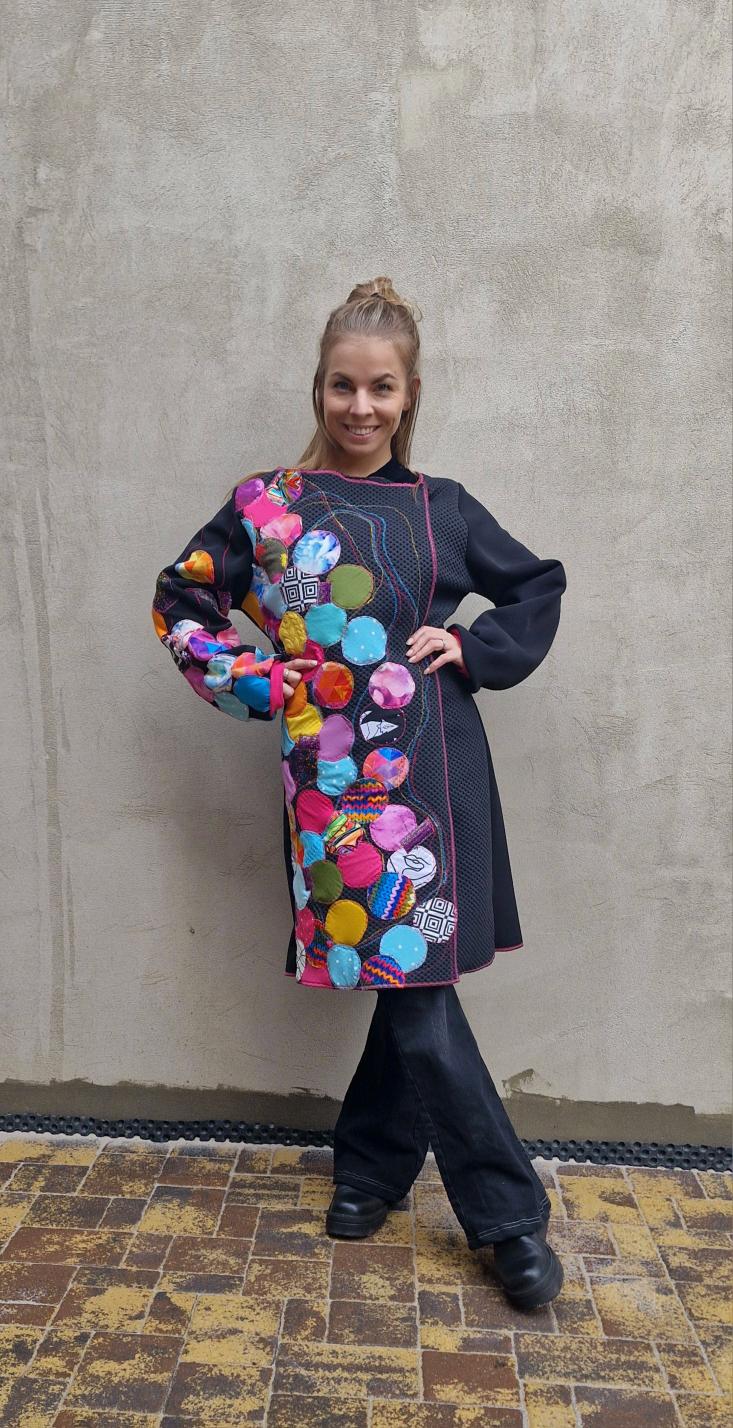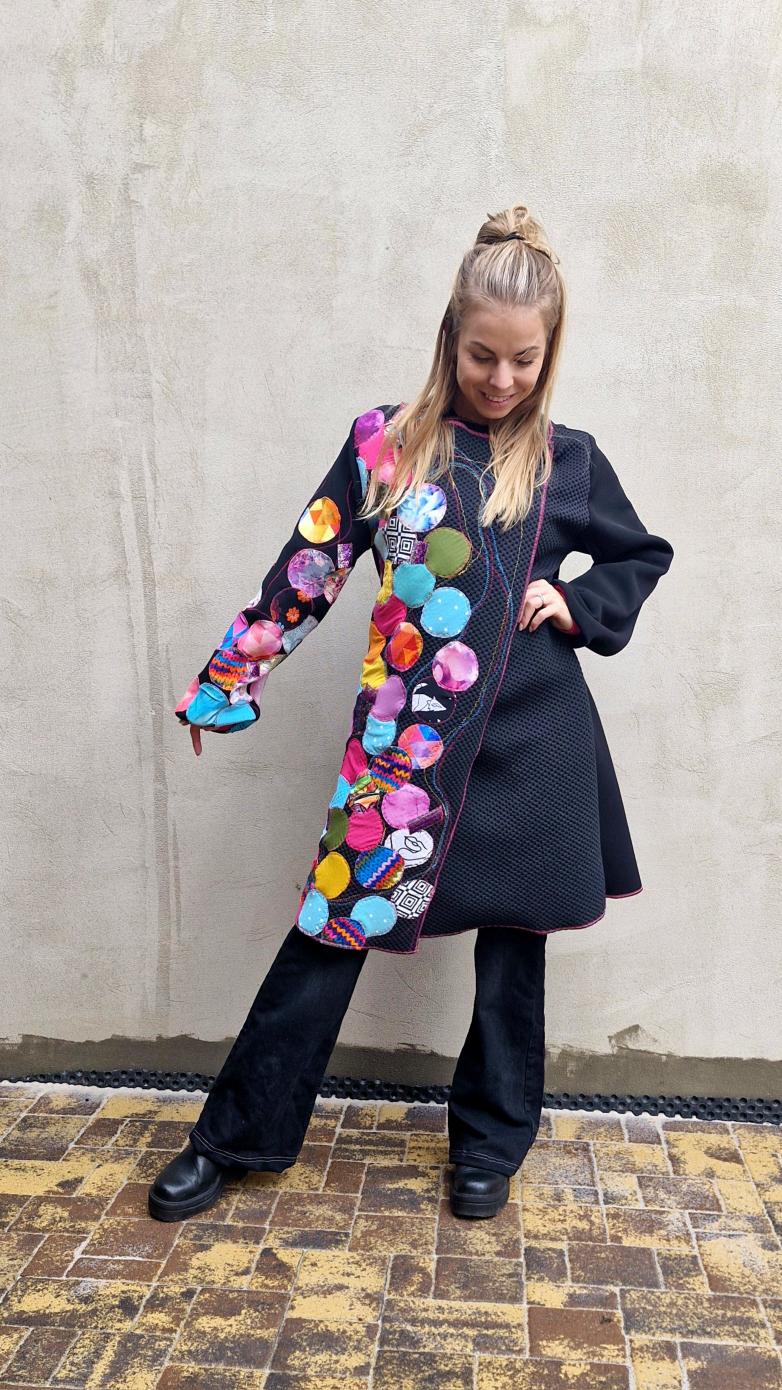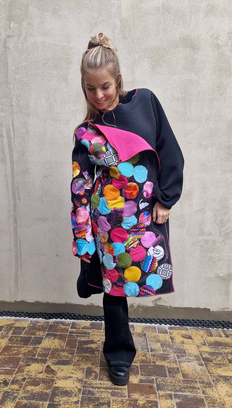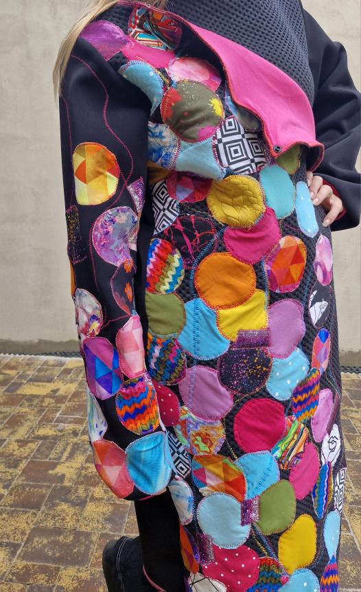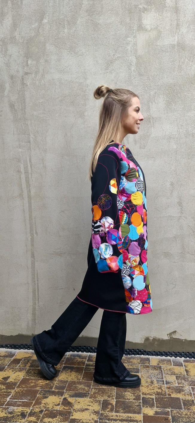 Dámský kabátek rovného střihu. Rukávy jsou široké v dolním okraji do mírného balónku. Pomocí klipsů se kabátek zapíná. Lze použít i clipsová pásek. Jedná se o můj projekt, kdy žádný kousek látky nepřijde na zmar. Zbytky látek mi stříhala má milovaná babička, která tu již 8 měsíců není, ale její energie je právě tady, v kabátku. Každičký kousek vzala do ruky. Nikde takový podobný kabátek na světě není, nechodí.